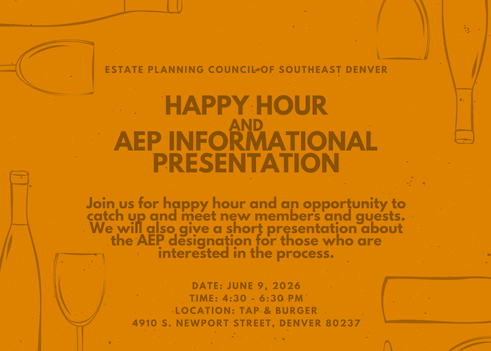 Join EPCSED for happy hour! We will also give a 15-minute presentation for members and guests who are interested in obtaining the Accredited Estate Planner® (AEP) Designation.
